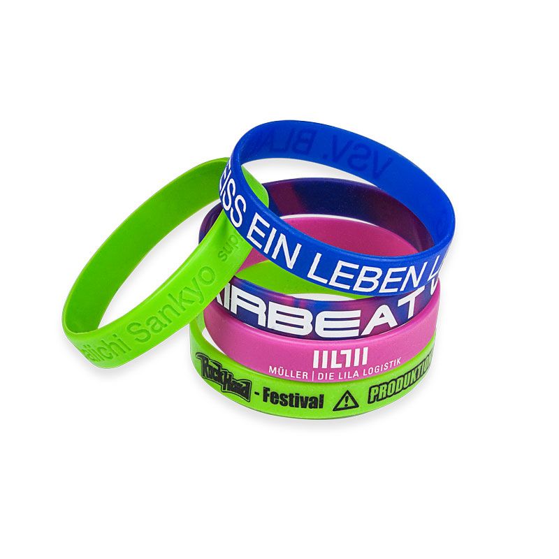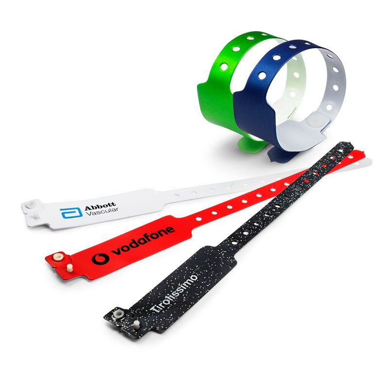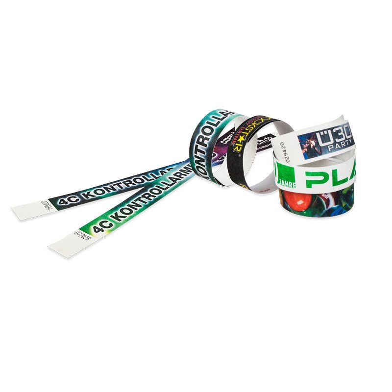 Wähle aus vielen verschiedenen Möglichkeiten. Wir bieten nicht übertragbare Stoffbänder mit gewebtem oder gedrucktem Motiv, Kunststoffbänder, Tyveks, aber auch übertragbare Silikonbänder.